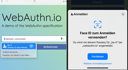 Exemplarisch lassen sich die Vorgänge der Registrierung und Authentisierung gut auf der Seite WebAuthn.io demonstrieren. Die Prozesse sind standardisiert und verhalten sich auf allen Seiten mit Passkey-Unterstützung gleich.